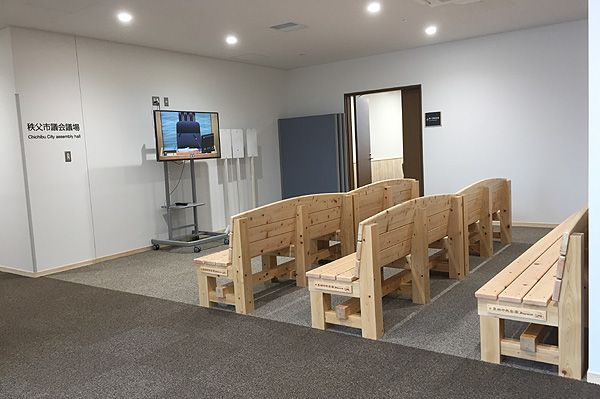 合計8基のベンチのうち、背もたれ付きのベンチ6基は新庁舎4階の議会ロビーへ、また、長さ5.2mもある大型ベンチ2基は、新庁舎2階の廊下へ設置しました。