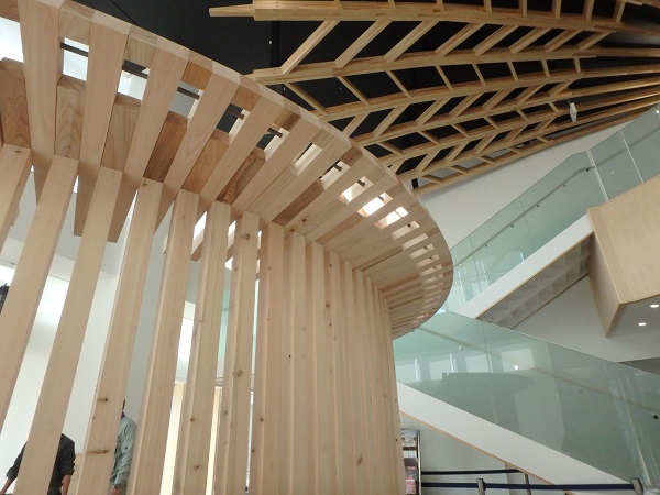 この家具は、新庁舎に調和したデザインにより、木の魅力を伝えるモニュメント、そして人と人とがふれあうベンチとしてつくられ、秩父の各地の祭りに登場する笠鉾のイメージから名称がつけられました。